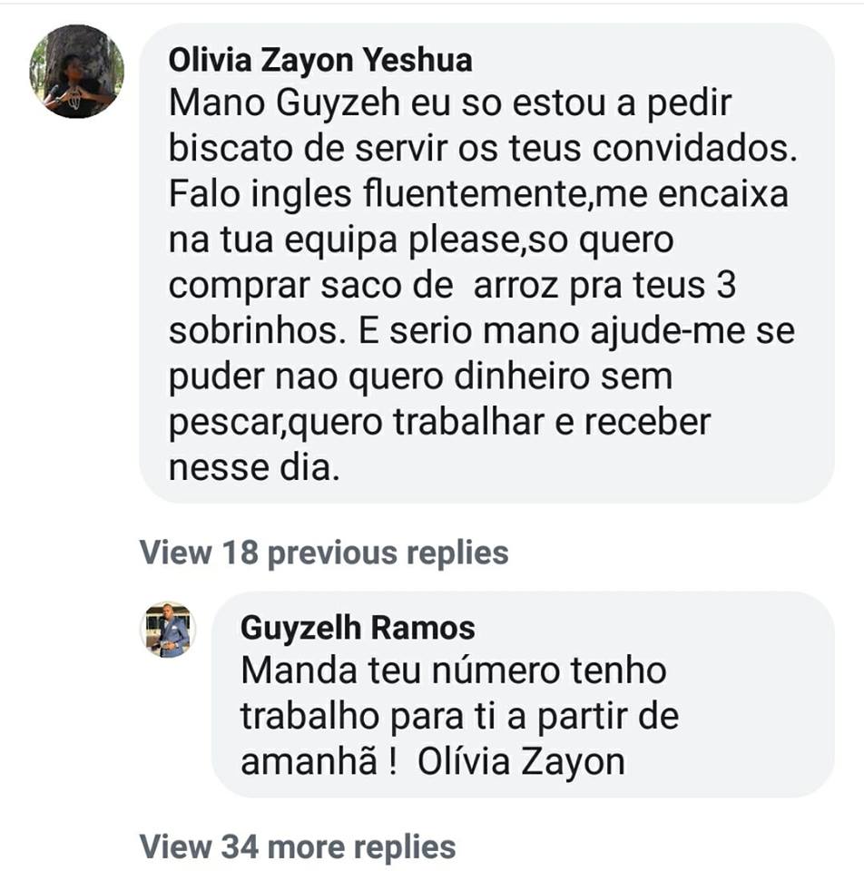 Após receber um pedido de emprego na inbox do seu Facebook, o empresário e promotor de eventos Guyzelh Ramos respondeu positivamente à candidatura da jovem identificada como Olivia Zayon Yeshua, oferecendo-lhe uma vaga de emprego, passando desde já a fazer parte da sua equipa.